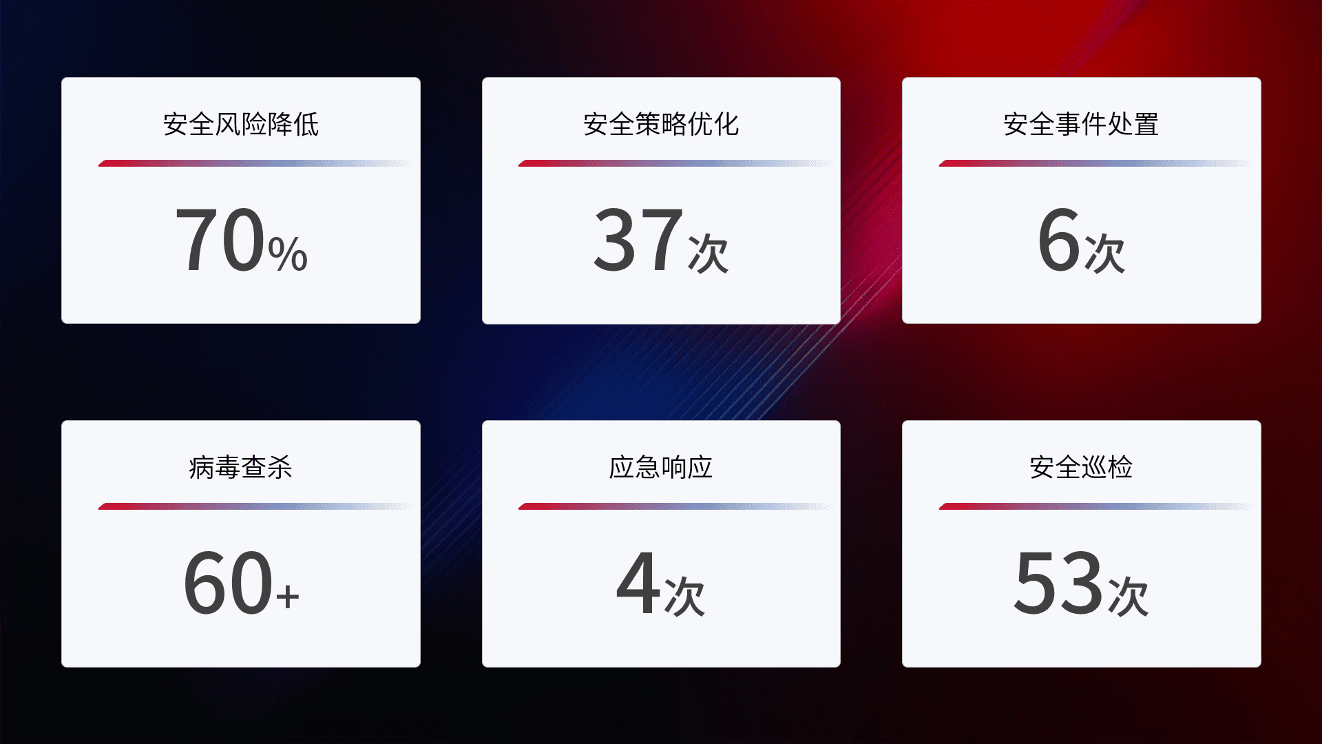 提供全面的安全事件报告体系,,包括处置报告、、、、周报、、、、季度和年度总结,,,结合持续监控,,,帮助客户深入了解网络安全状况。。